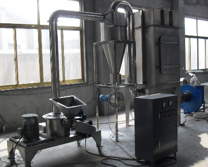 物料由料斗经螺旋输送器进入粉碎室,被高速旋转的刀片剪粉碎,物料在粉碎过程中,受到高速刀片及齿圈的作用形成细粉,设备内部带分级装置,成品通过分级轮,达不到设定细度的物料被叶轮击回粉碎室继续研磨,直到达到细度,被负压风力吸出粉碎室,设备通过负压风运的方法把物料运入旋风分离器,袋式除尘器、排出物料达到产品的要求。